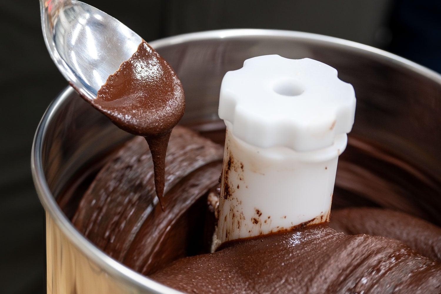 香りや風味を引き出す温度でローストし、一つ一つ丁寧に薄皮を剥いたカカオ豆。きび砂糖を加えて、滑らかな生地になるまで混ぜ合わせたら、型に流して冷やし固める。