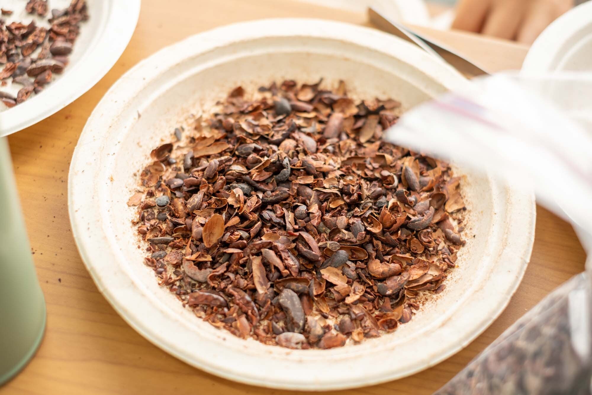 カカオ豆の薄皮を丁寧に剥く。まろやかな甘さのきび砂糖と混ぜ合わせる。